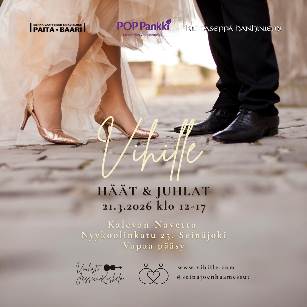 VIHILLE Häät & Juhlat on säkenöivä uutuus Suomen hää- ja juhlatapahtumien joukkoon. Tapahtuma kokoaa yhteen Seinäjoen alueen upeat juhla-alan yrittäjät. Tervetuloa inspiroitumaan ja tutustumaan juhlapäivänne ammattilaisiin. Kaunis Kalevan Navetan miljöö tarjoaa loistavat puitteet tapahtumalle.