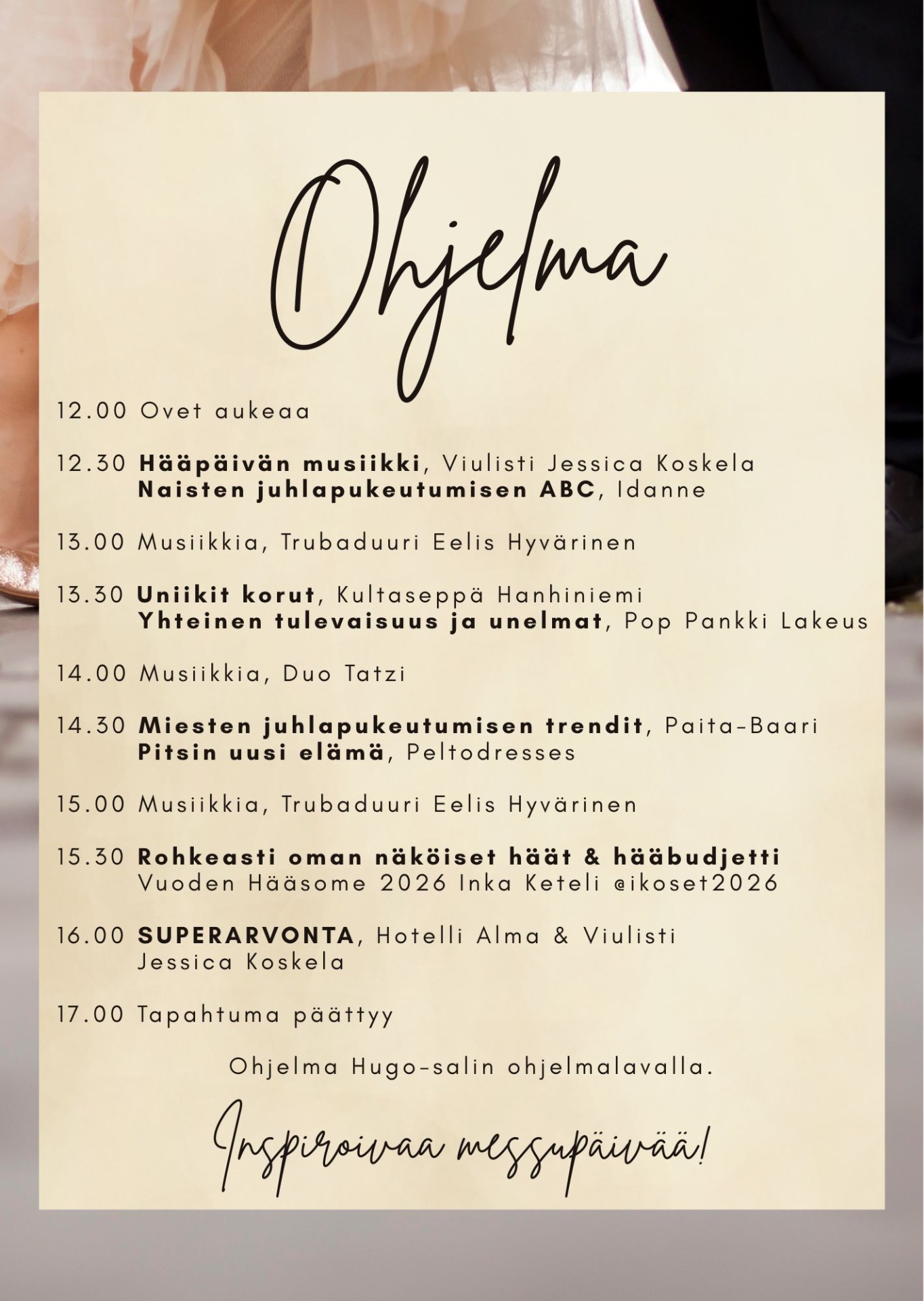 Päivän ohjelmassa on mm. mielenkiintoisia asiantuntijapuheenvuoroja, hyvää musiikkia, hääkakkutasting, erilaisia maistatuksia, tarjouksia, arvontoja ja kuoharibaari. Itikka tilassa voit äänestää kauneinta hääkimppua ja Hugo -salin sisäänkäynniltä löydät kuvausseinän sekä hauskan palautepuhelimen. Päivän huipentaa superarvonta, jossa arvotaan viulisti vihkimiseen sekä Hotelli Alman huikea hääsviitti, illallis paketteineen! Mukana on myös vuoden hääsome 2026 -voittaja Inka Keteli. @ikoset2026